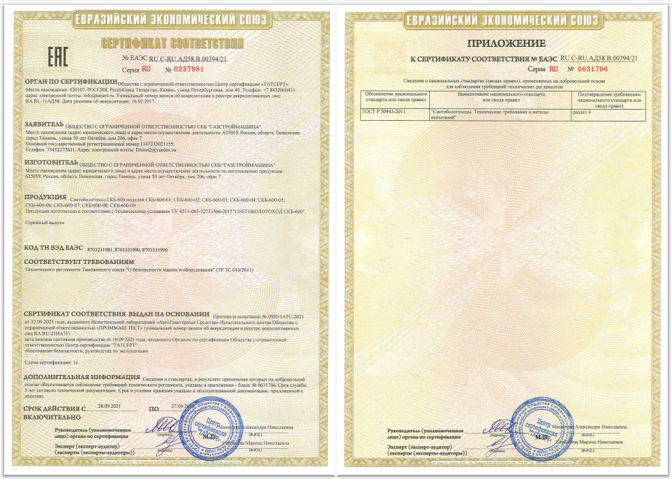 В стандартную комплектацию СНЕГOБОЛОТОХОДА СКБ включены гидроусилитель рулевого управления и межколесные самоблокирующиеся дифференциалы в переднем и заднем мостах, большой люк и внешняя отделка алюминием.